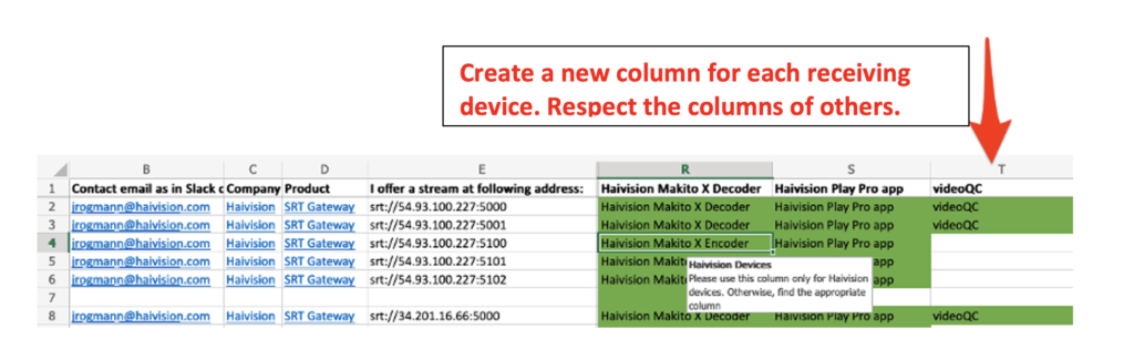 - For each device to receive a stream, please create a separate vertical column.